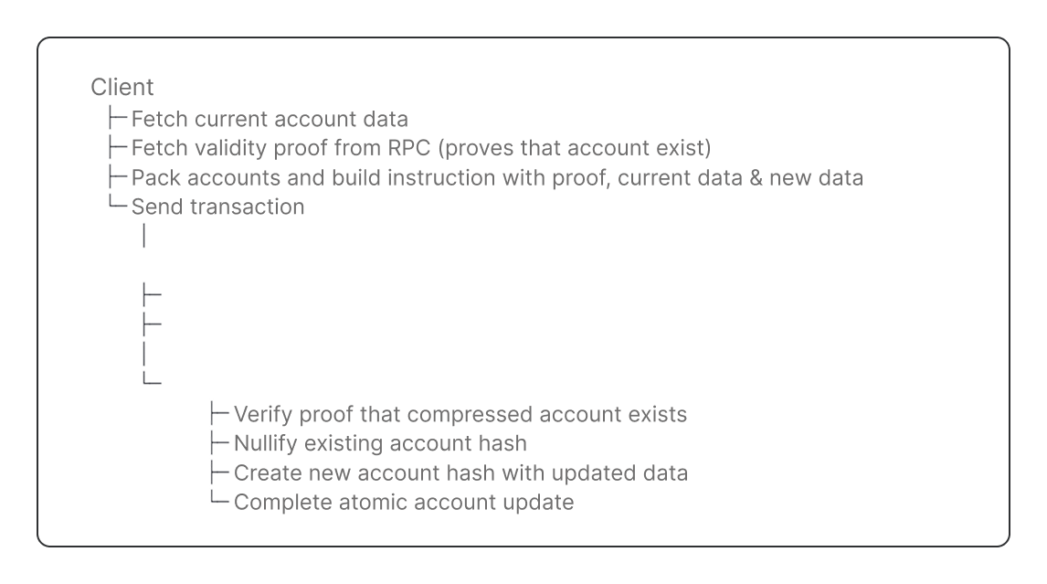 This guide will cover the components of a Solana program that updates compressed accounts.Here is the complete flow: